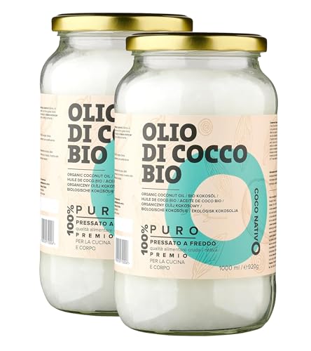 OLIO DI COCCO BIOLOGICO EXTRA VERGINE COCONATIVO –2X1000ML (2L)– CRUDO E SPREMUTO A FREDDO; ORGANICO E PURO; NON PROCESSATO, (BIO NATIVO),IDEALE PER CAPELLI, PER IL CORPO E AD USO ALIMENTARE